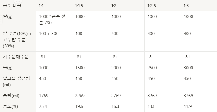급수 비율별 예상 알코올 농도 오늘의 실습 - 소곡주 덧술 빚기
