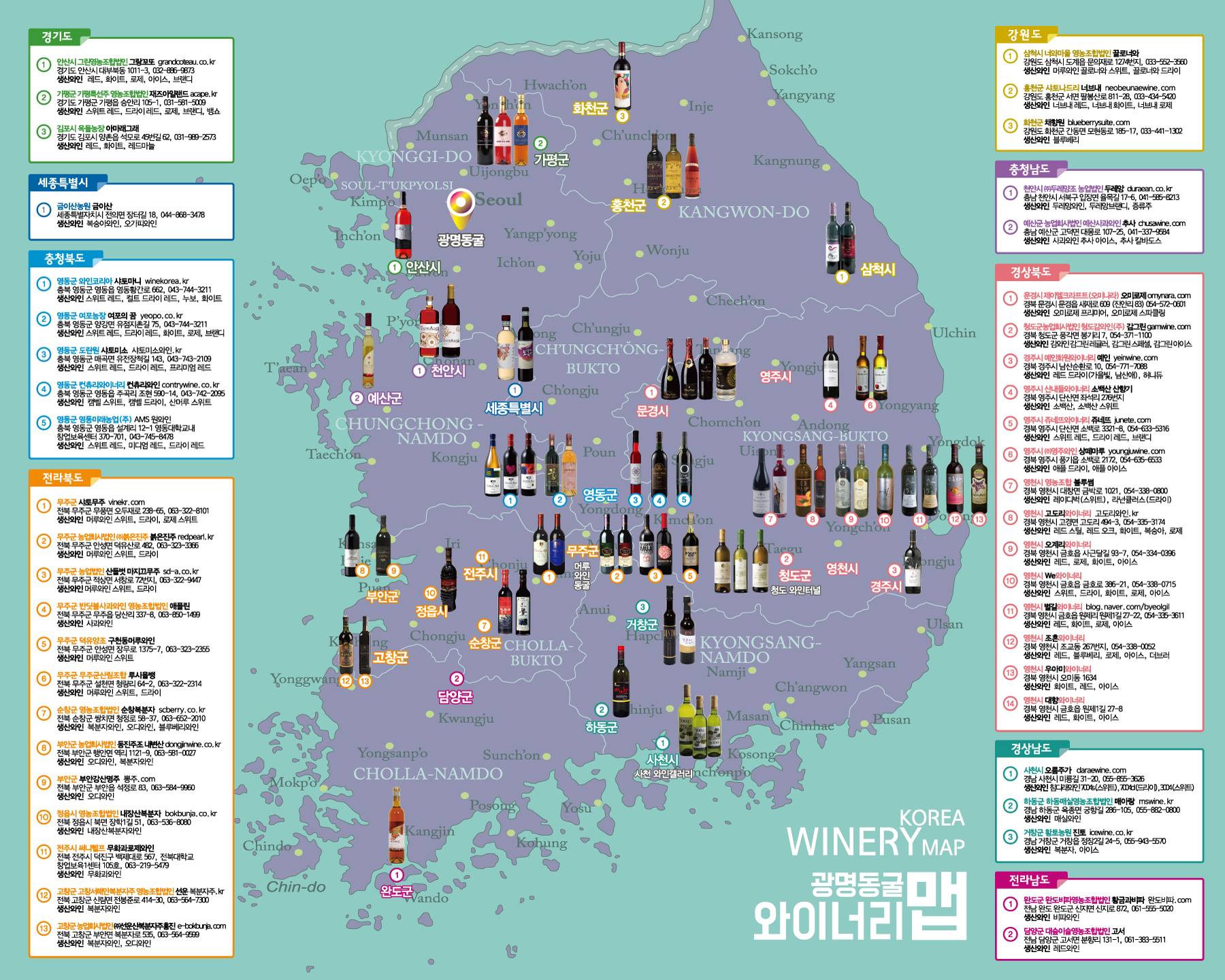우리나라 와이너리 맵을 한 번 보면, 우리나라에 나오는 와인이 없다는 생각은 절로 사라지실 겁니다. 우리나라에서는 정말 다양한 와인이 나오고 있는 추세입니다.
