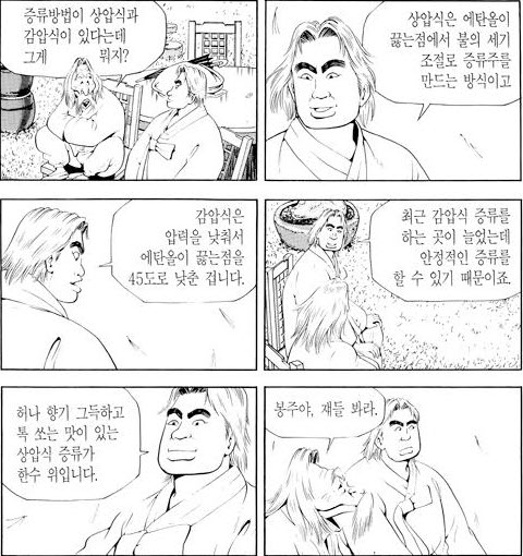 물의 끓는 점은 100도이고 알코올은 78도에서 서서히 끓기 시작합니다. 물과 알코올의 끓는점의 차이를 이용하여 고농도 알코올을 얻어내는 과정에서 양조주를 서서히 가열하면 끓는 점이 낮은 알코올이 먼저 증발하는데, 이 증발하는 기체를 모아서 냉각시키면 다시 고농도의 알코올 액체를 얻어 낼 수 있습니다. 소주는 막걸리를 증류한 것이고, 브랜디는 와인을, 위스키는 보드카를 증류해서 만들어냅니다.