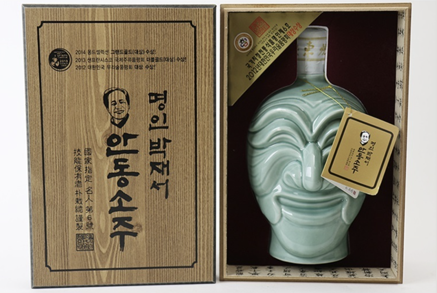 양반탈 모양이 독특하고 독보적인 디자인의 안동소주입니다. 양반탈 모양의 소주는 여태껏 제가 본 술병의 디자인들 중 가장 인상깊었던 디자인입니다. 술을 따를 때 생각보다 그립감이 나쁘지 않더라구요 ㅎ 선물로도 주기 좋은 소주입니다.