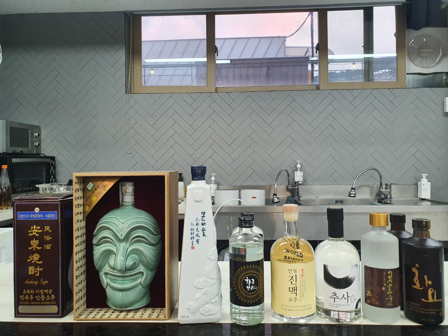 왼쪽부터 민속주 안동소주, 명인 안동소주, 문배술, 황금보리. 안동진맥소주, 추사, 고소리술, 화요 입니다.