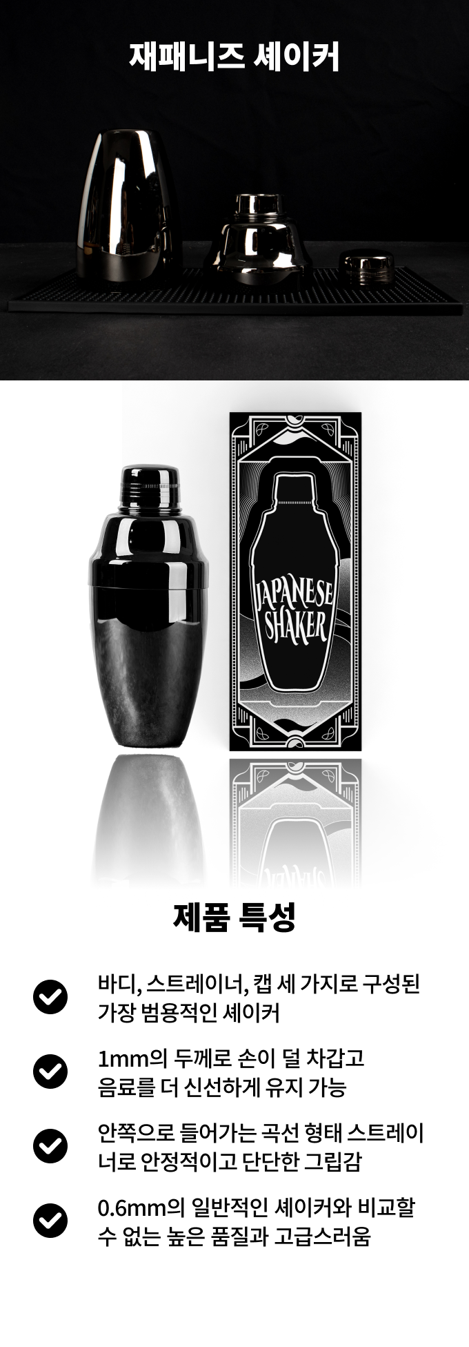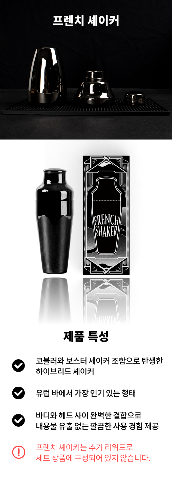 현재 총 세 가지 종류의 칵테일 셰이커 판매를 하고 있으며, 1번 재패니즈 칵테일 셰이커 2번 보스턴 셰이커 3번 프렌치 셰이커 모두 각 각의 개성과 특이점을 지니고 있습니다.