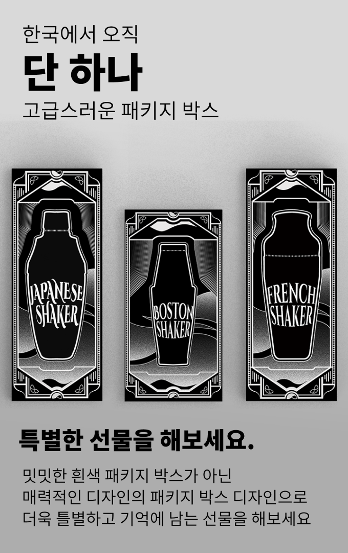 시중에 칵테일 셰이커 세트는 이미 많이 시판되고 있습니다. 하지만 스테인리스 은색 단색으로된 셰이커 형태에 다소 저렴한 흰색 박스로 포장되어 있는 것을 보면, 선물하기에도 부족하고 특색이 없는 것이 참 아쉽다고 생각했습니다.