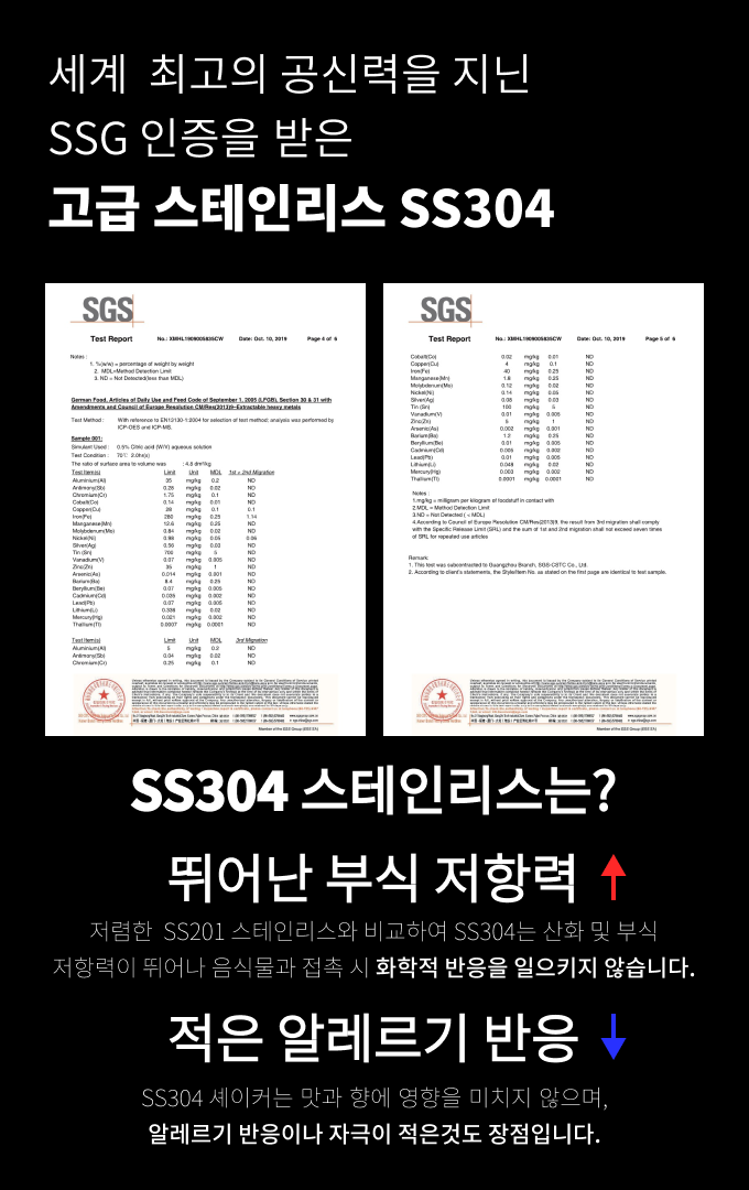 묵직하고 고급진 매력을 지닌 건메탈 블랙 컬러에 세계 최고의 공신력을 지닌 SSG 인증을 받은 고급 스테인리스 SS304소재를 사용했으며, 레이저 커팅으로 접합 부분은 절대로 베이지 않는 동근 모서리로 되어 있습니다.